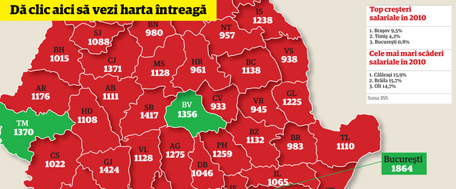 Castigurile salariale ale romanilor au scazut considerabil de-a lungul anului 2010, in majoritatea judetelor tarii. Exista insa si cateva oaze de prosperitate.