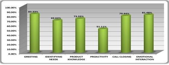 - In evaluarea generala a criteriilor de calitate la nivelul celor 7 industrii, cele mai bune rezultate (peste 80%) au fost obtinute in ariile “preluare apel” si “aprecierea emotionala a interactiunii”. Zonele de imbunatatire per ansamblu (sub 70%) sunt “proactivitatea” si “identificarea nevoilor clientului”;